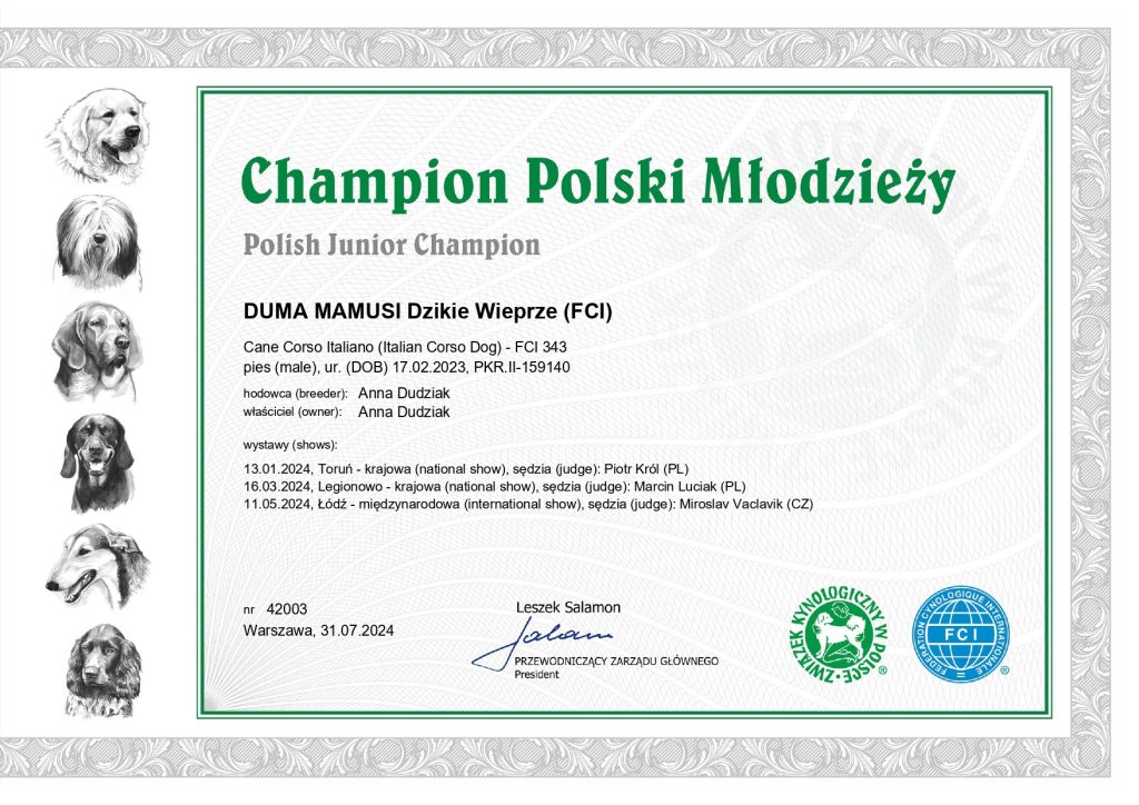 Cane Corso to pies wyjątkowo lojalny, inteligentny i oddany swojej rodzinie. Jest znany ze swojej silnej więzi z opiekunem i naturalnego instynktu do ochrony. To pies dla doświadczonego właściciela. Potrzebuje wczesnej socjalizacji, pozytywnego szkolenia i jasnych zasad. Nie jest to rasa dla osób szukających łatwego pupila – ale w rękach świadomego opiekuna staje się wyjątkowym przyjacielem i obrońcą.